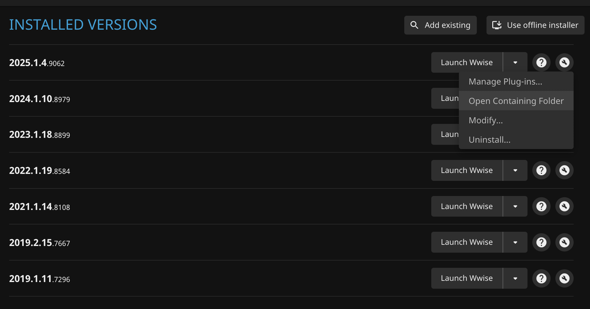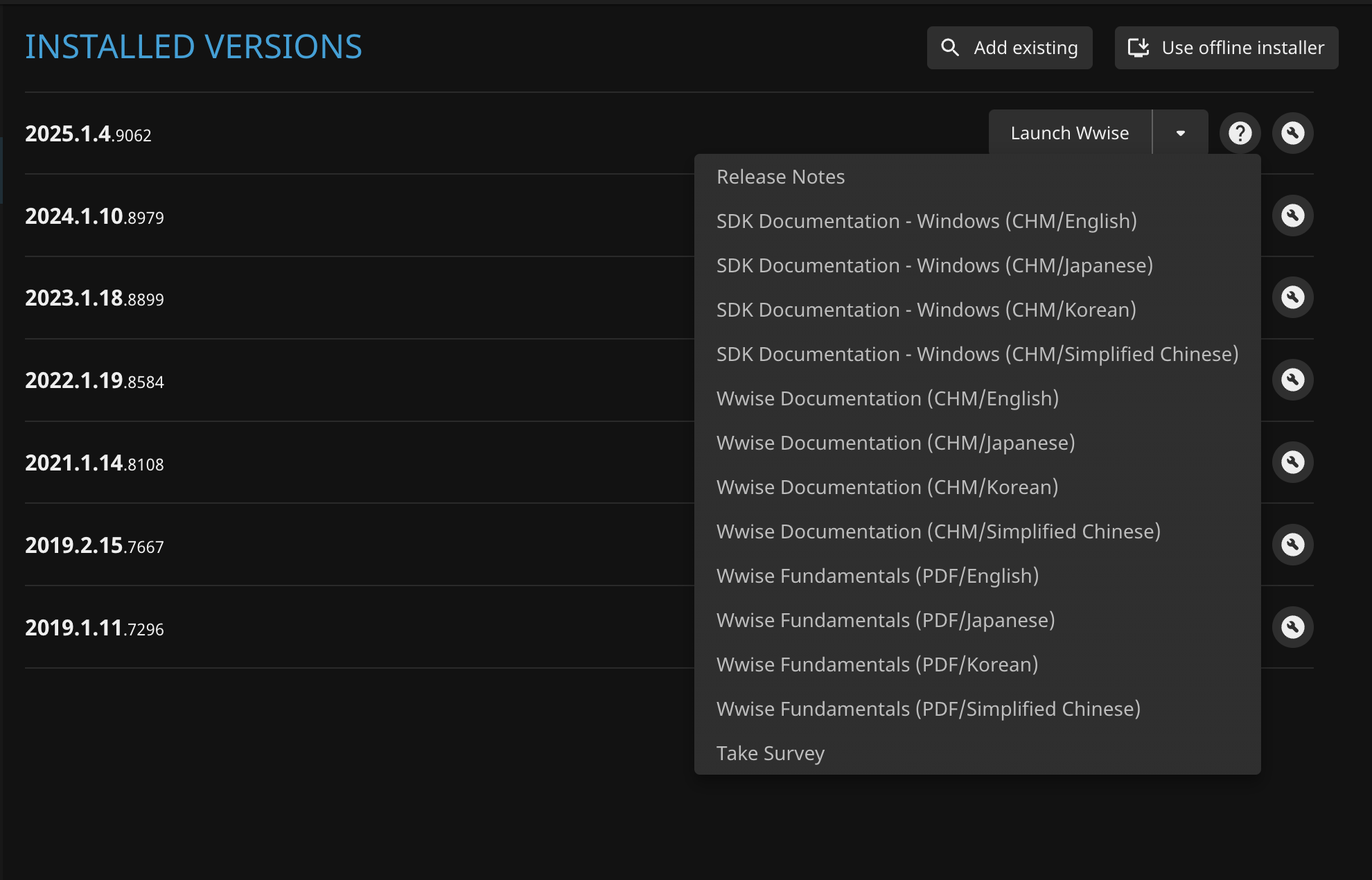 - Find the required documentation. In Audiokinetic Launcher, you can click the question mark to the right of the version to open the documentation, or click the “wrench icon” on the right and click Open Containing Folder in the popup menu. Most documents can be found in the Wwise installation directory.
