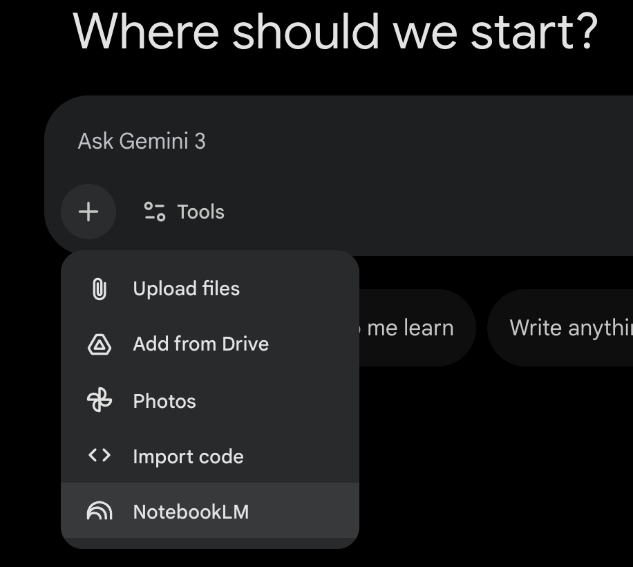 In Gemini’s Q&A box, click +, select NotebookLM in the popup menu, and you can let the notebook participate in the conversation. The NotebookLM notebook will serve as Gemini’s external knowledge base, exerting the function of Agentic RAG.